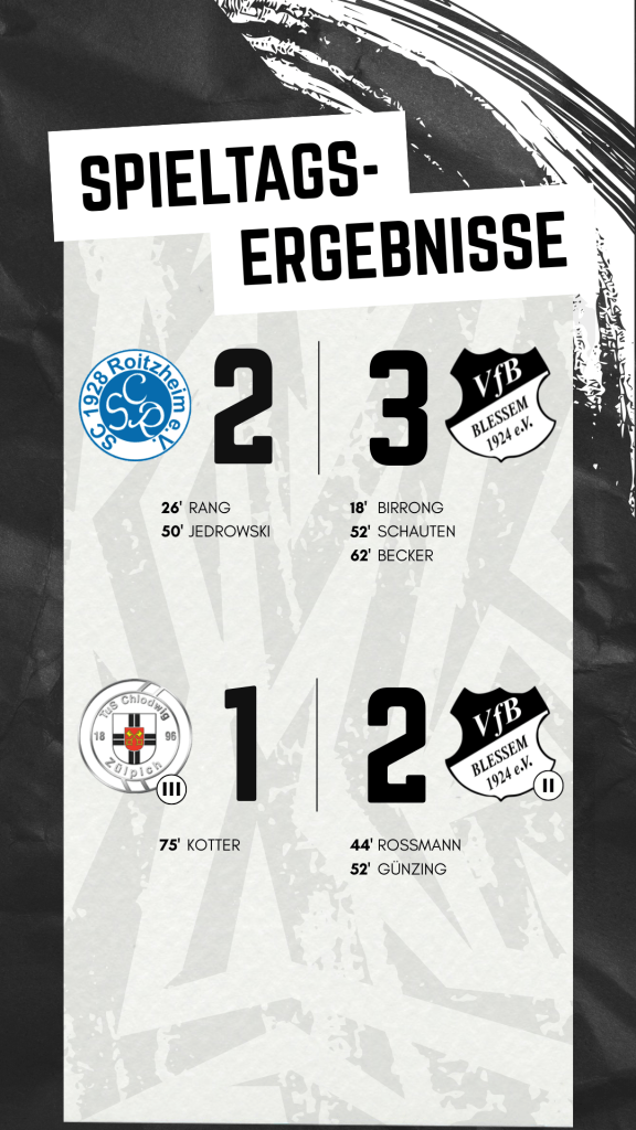 Arbeitssieg unserer zweiten Mannschaft beim TuS Chlodwig Zülpich III. Kurz vor der Halbzeitpause erzielte Sven Roßmann (44. Minute) zu einem psychologisch wertvollen Zeitpunkt die Führung. Für das 0:2 sorgte Daniel Günzing (52. Minute). Durch einen verwandelten Elfmeter in der 75. Minute konnte die Heimmannschaft den 1:2 Anschlusstreffer herstellen. Nichtsdestotrotz wurden drei Punkte mit nach Blessem genommen.